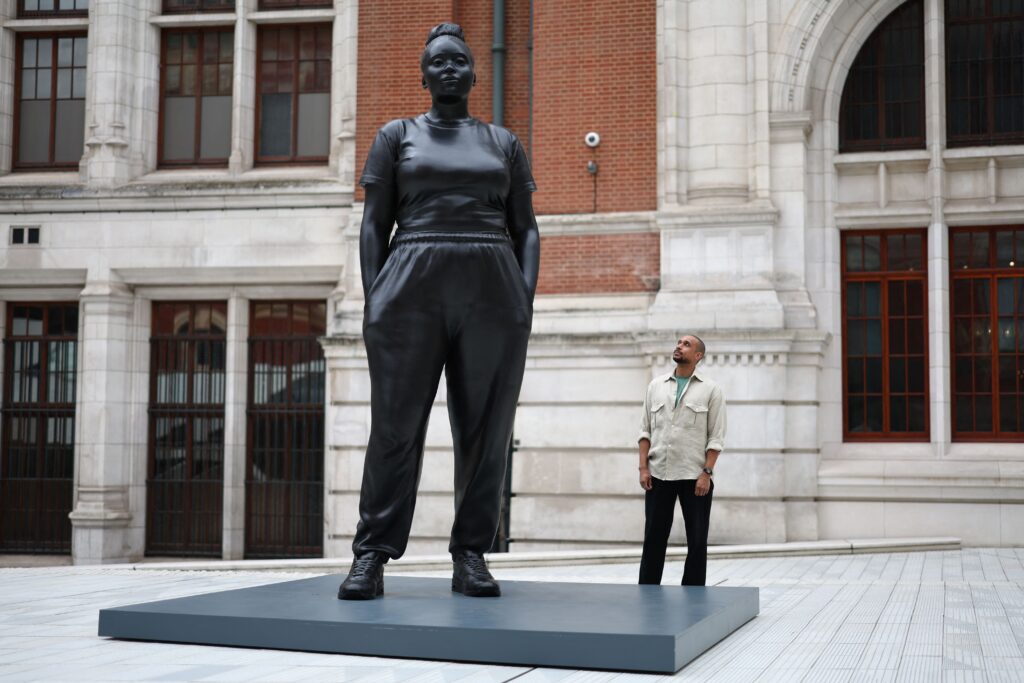 “A fictionalized character constructed from images, observations, and open calls spanning between Los Angeles and London, the young woman depicted in “Grounded in the Stars” carries familiar qualities, from her stance and countenance to her everyday clothing. Through scale, materiality, and posture, “Grounded in the Stars” disrupts traditional ideas around what defines a triumphant figure and challenges who should be rendered immortal through monumentalization,” his website reads.