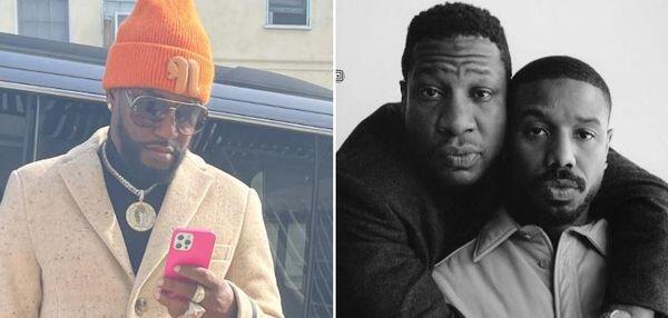 The photos in question are from a photoshoot accompanying the actors’ feature in The New York Times. The first image is a black-and-white shot of Majors behind Jordan with his arm draped around his Creed III director. The second photo, in color, is a closer shot with both gentlemen looking at the camera while Majors rests his chin on Jordan’s shoulder.