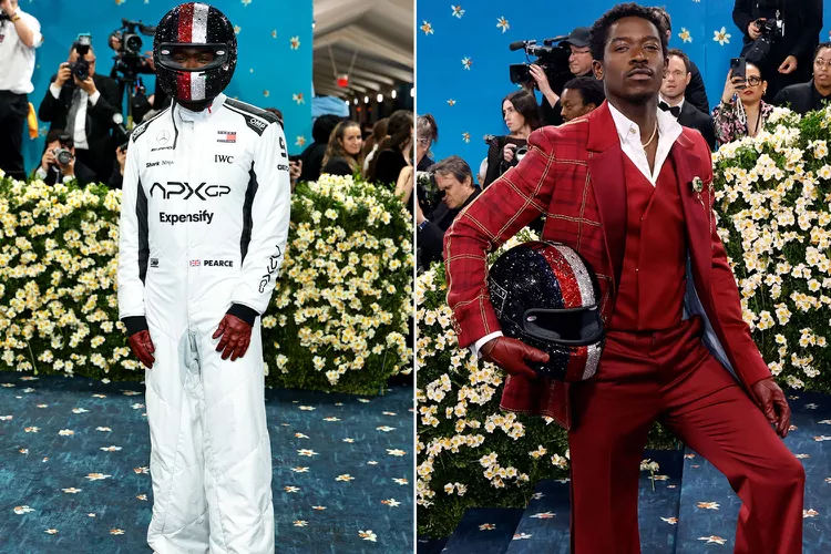 Idris’ first look was an F1-inspired racing suit — a direct nod to the racing costumes that he and his F1 costar Brad Pitt sport in the upcoming Warner Bros. film. Then, with the help of his assistants, Idris stripped down, revealing a custom Tommy Hilfiger suit that was perfectly aligned with this year’s “Tailored for You” dress code. And you couldn’t miss his 20,000-crystal bedazzled helmet!