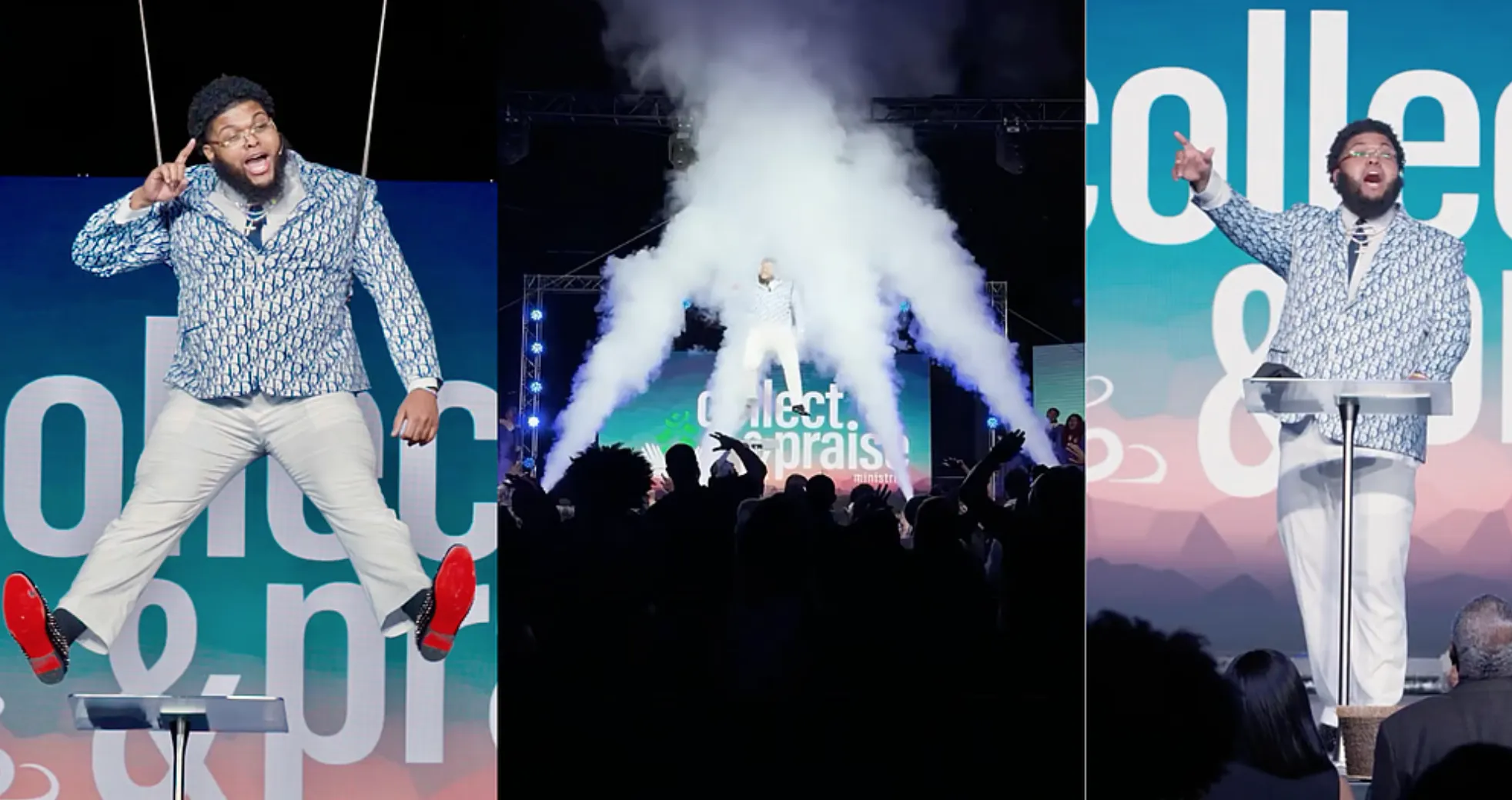 The sketch opens with Druski suspended high in the air before a packed congregation while singing along to Kirk Franklin’s 1998 hit “Revolution.” He also sports luxe designers Christian Dior and Christian Louboutin.
