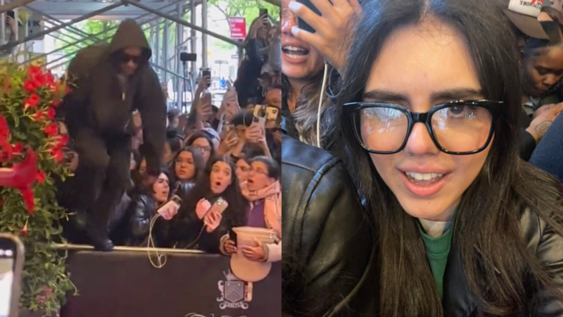 The rapper was caught in a crowd of fans stuck behind a barricade around the hotel and jumped over to make his way through. In the process, he pushed a fan, knocking her glasses off.
