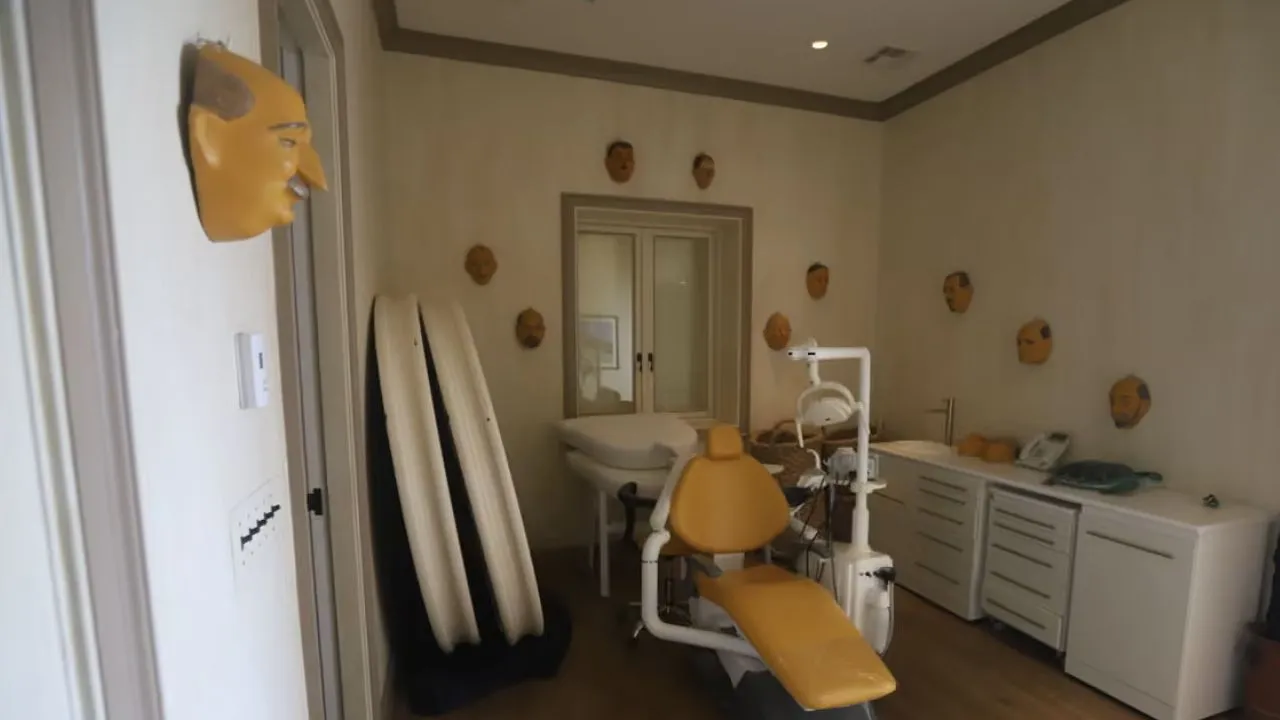 The photos taken from Epstein’s island include an image of a chalkboard showing the words “fin,” “intellectual,” “deception” and “power.” Another image shows a dentist’s chair and masks hanging on a wall. According to the New York Times, the chair may belong to one of Epstein’s ex-girlfriends, who was studying to become a dentist. She also shared an office with one of Epstein’s shell companies, the Times reported.