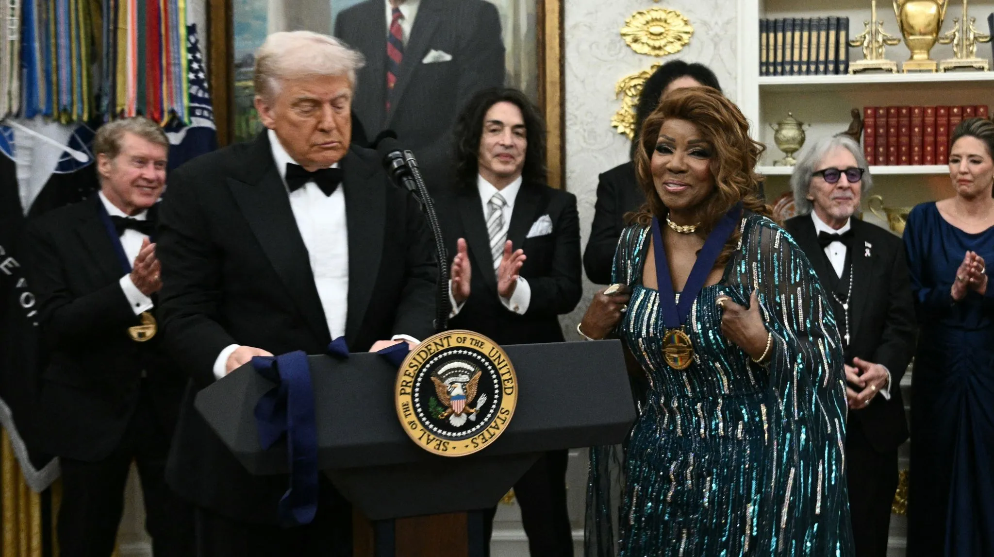 “Nobody did it like Gloria Gaynor,” Trump said before presenting the medal to Gaynor during the ceremony. “That’s a good head of hair. That’s beautiful,” Trump added as he placed the medal on her.