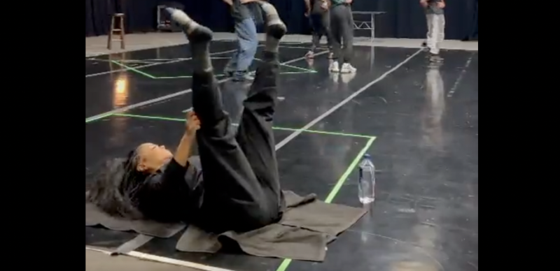 The video shows Jackson’s dancers practicing choreography in the background while she lies on her back, stretching her legs. She takes each leg and bends it all the way back to almost the same level as her head.