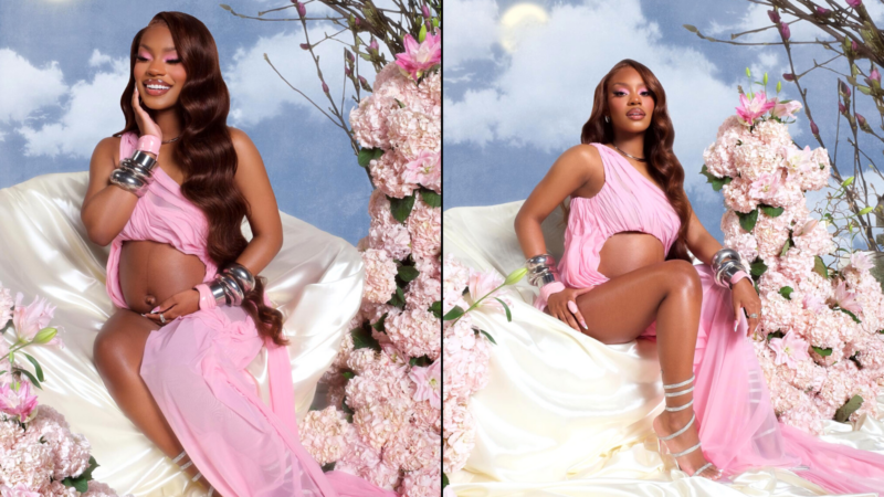 Monaleo, whose real name is Leondra Roshawn Gay, posted pictures from a maternity photoshoot she did for the occasion. The 21-year-old wore a baby pink draped gown designed by Di Petsa. The dress featured several cutouts, including an opening at the stomach revealing her baby bump. She also wore silver strappy stilettos by shoemaker Jessica Rich and silver and pink bangles by the Brooklyn-based jewelry brand Alexis Bittar.