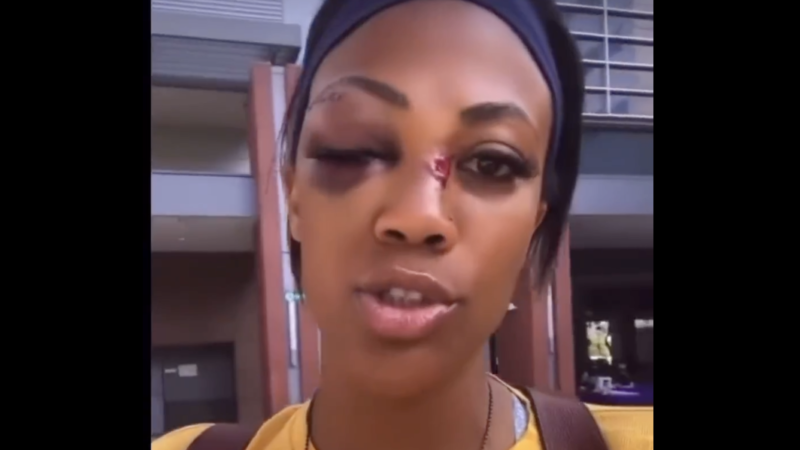 Glass described her gruesome injuries and showed her severely swollen and bruised eye after a 51-year-old male hurled a metal pipe at her head, the New York Post reports.