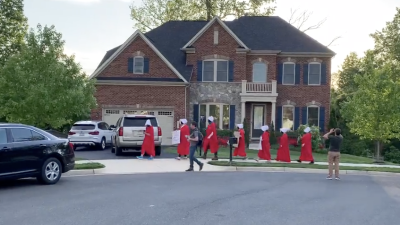A video of the protest shows seven people dressed in red robes and white bonnets silently walking outside of Barrett’s home in Falls Church, Virginia, TMZ reports. They held up signs with several slogans, including “keep your rosaries off my ovaries” and “we did not elect people of praise.” According to TMZ, people also shouted, “We’re not protesting, this is performance art.”