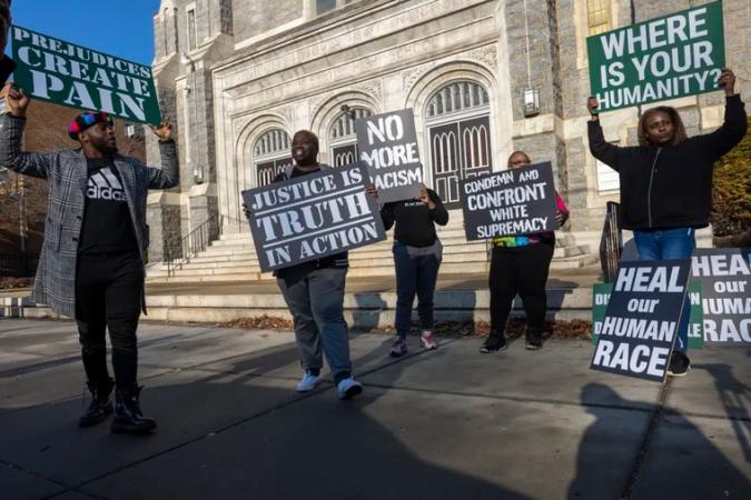 Following the viral spread of a racist video showing students dressed in blackface, protesters gathered outside St. Hubert Catholic High School for Girls in Holmesburg, Philadelphia, on Wednesday morning.