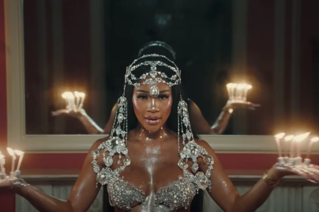 “Comin’ live on my birthday / Spendin’ hundred racks on a new chain,” she raps, surrounded by her signature icy blue hue.