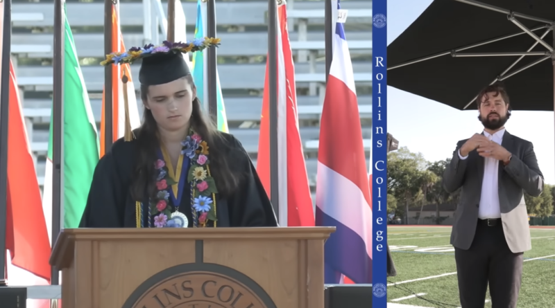 Rollins College valedictorian Elizabeth Bonker ’22, who’s affected by non-speaking autism and communicates solely by typing, urges her fellow graduates to use their voices, serve others, and see the value in everyone they meet.