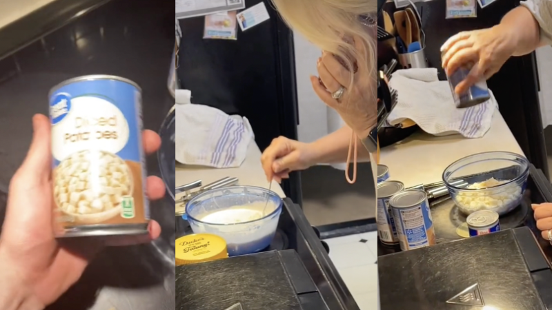 The video showed Godfrey’s mom putting a can of Great Value diced potatoes still swimming in potato juice into a bowl on the stove. Then, she adds two big scoops of what looks like mayonnaise and stirs.