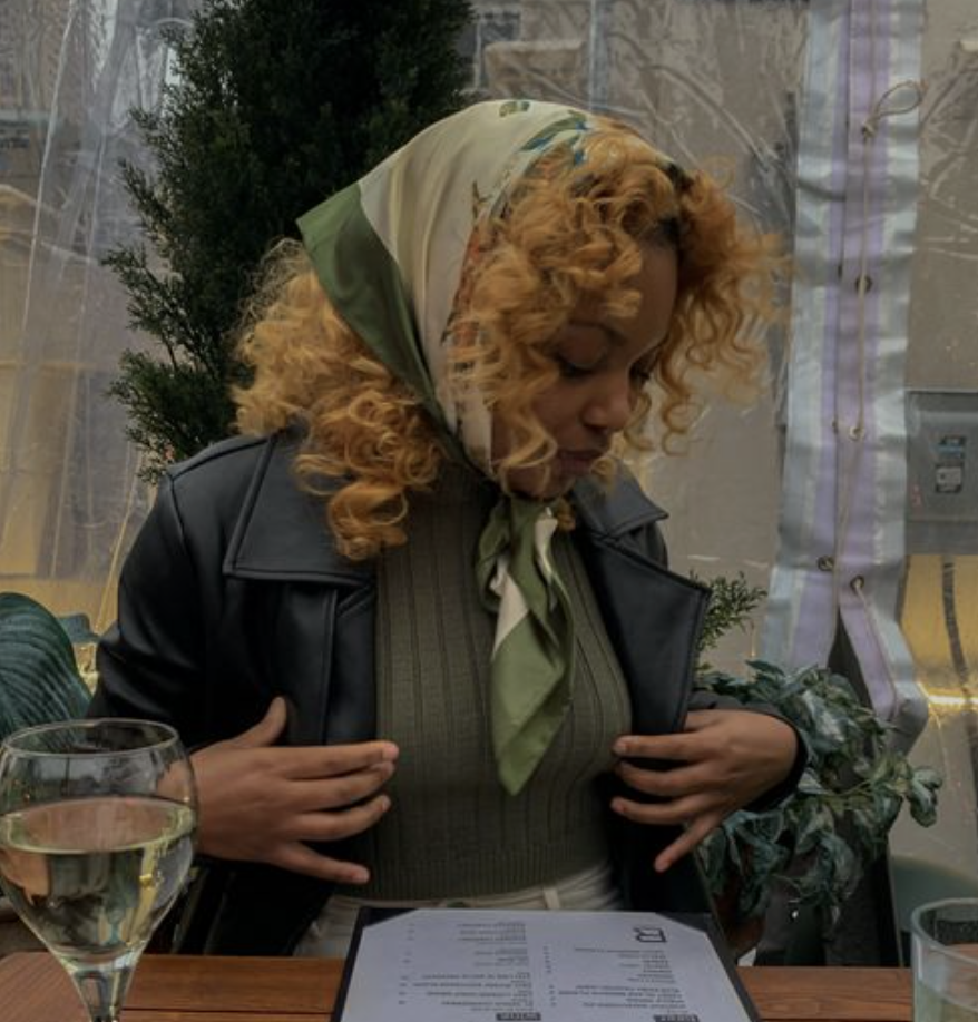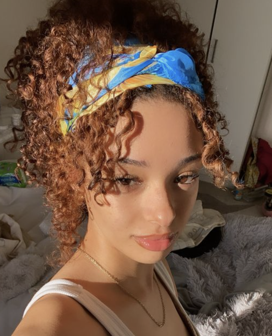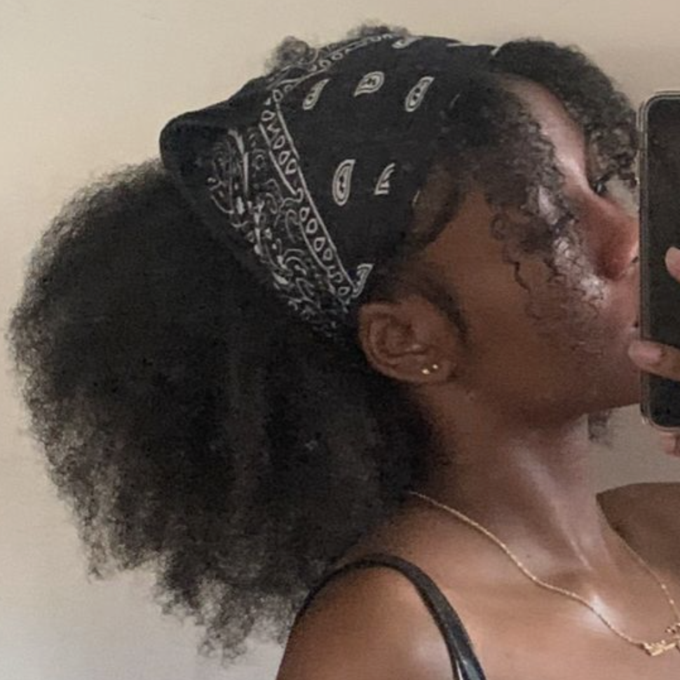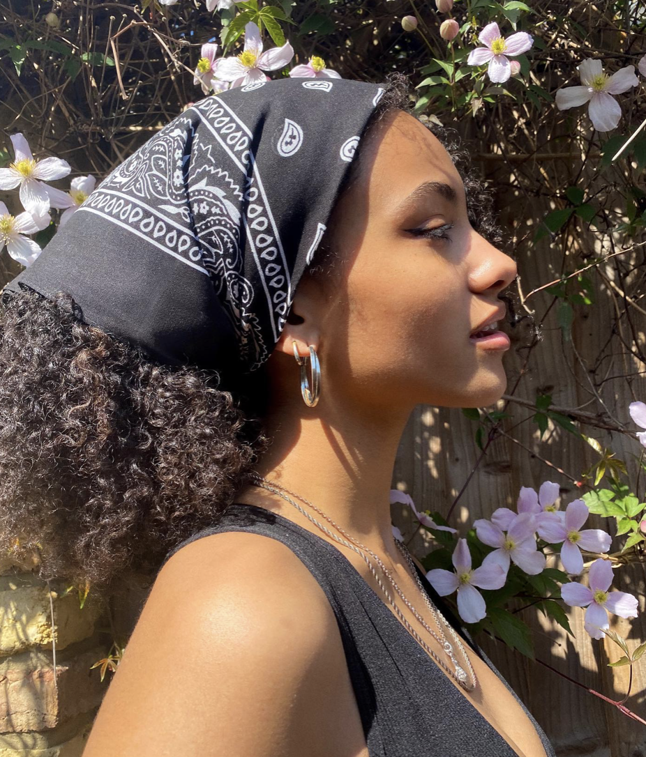 From 3b to 4c curls, styling your bandana to accentuate two face-framing pieces is a quick and easy serve. As long as your curls are detangled and moisturized, any kind of coil can elevate this look.