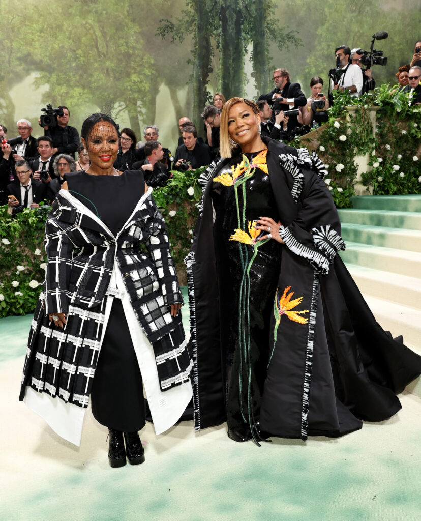 Latifah stepped out with her longtime partner Ebony Nichols by her side at this year’s Met Gala carpet. She was dressed in a Thom Browne sequined dress. The real treat was the beautiful bird-of-paradise embroidery attached from head to toe. She paired the look with oversized outerwear that coordinated with her date’s black and white hourglass coat.