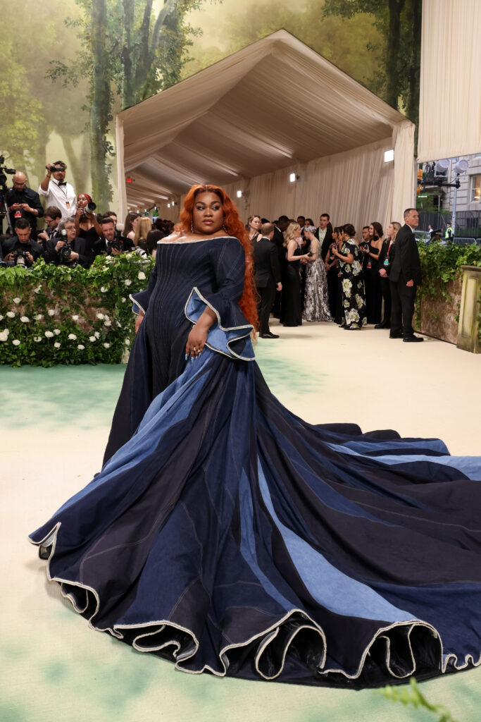 Taylor never fails to miss a fashion moment, and this time, it’s no different. The talented creative’s look is “The Rose in Harlem,” personified by her bright red dress. Her gown adds more drama with its high slight as the bottom drapes from behind. Her pairing of gold jewelry with her platinum blonde hairdo tied the entire piece together.