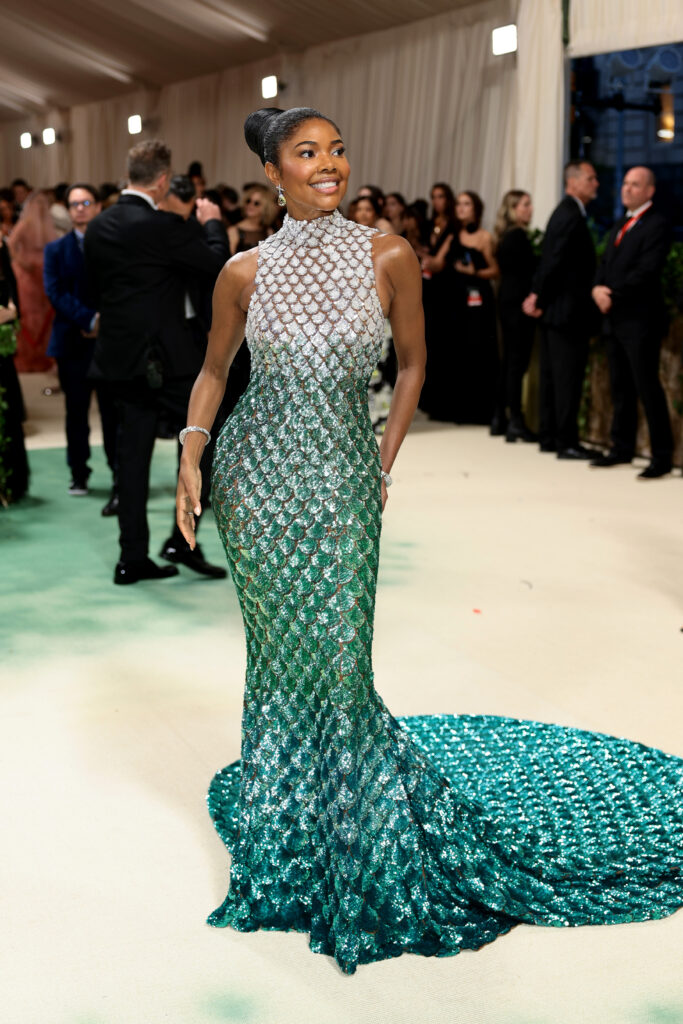 Union took a spin on the theme by wearing a shimmering, mermaid high-neck Michael Kors gown. The purple and turquoise ombre colors blended into each other as the blue-to-green shades took over toward the bottom half of the dress.