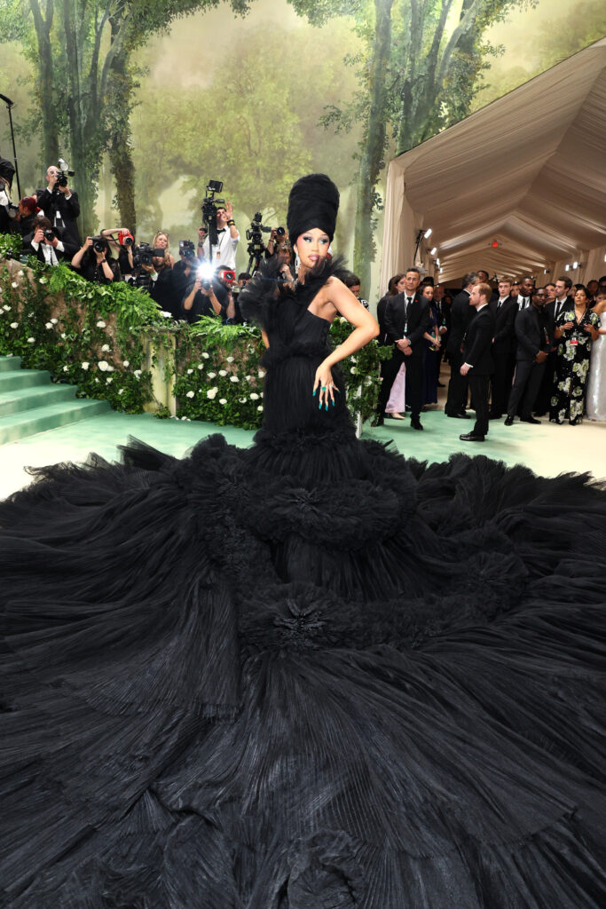 Cardi B shut the red carpet down with her massive black ball gown. The rapper was the centerpiece of the stairs, as her dress covered a large part of the carpet. Her gown was the main character, and she topped it off with emerald and diamond jewelry.