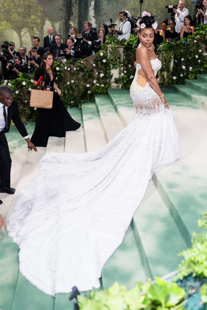 The actress and comedian looked like a walking garden as her custom floor-length LOEWE gown was decorated with colorful flowers. The floral halter-neck piece starts off all-white and then blooms into a burst of colors as it reaches the end. The hand-painted embroidered flowers added a unique three-dimensional twist. For her debut Met Gala appearance, Edebiri gets an A+.