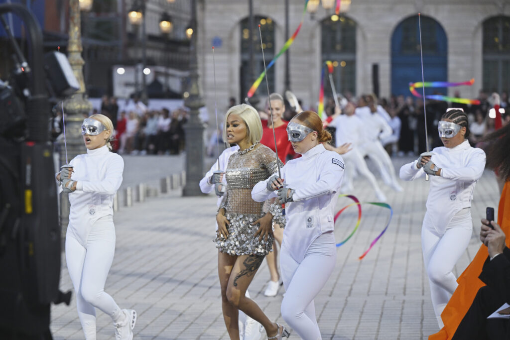 French-Malian singer Aya Nakamura opened the show with a powerful rendition of “Fly.” Dressed in a stunning satin brown gown with off-the-shoulder tulle ruffles and a high-slit skirt, she mesmerized the audience with her look and sound. Her performance was accompanied by models, including FKA Twigs, wearing vintage Chanel looks. Cyclists also circled the stage, evoking the spirit of the Tour de France.