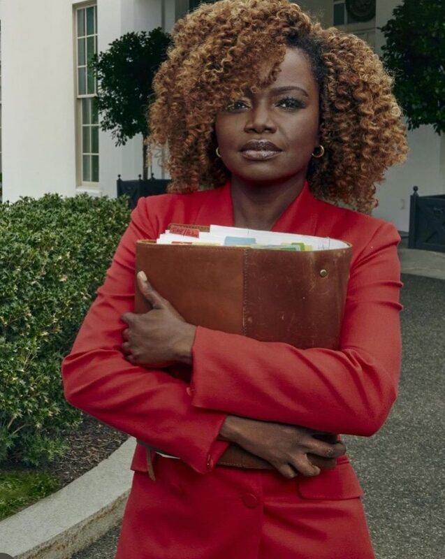 There’s a lot about the Vogue images featuring White House press secretary Karine Jean-Pierre that may stop a reader in their tracks. There’s the striking red suit she’s wearing. The unwavering expression on her face. And the hair. Oh, that hair. It is full of body, the most perfect auburn-blonde shade to compliment her skin and frames her face in just the right way. If you are a woman, who like Jean-Pierre, wears natural hair, you most certainly will also notice that her natural curls are on full display in what many call “The Fashion Bible.”