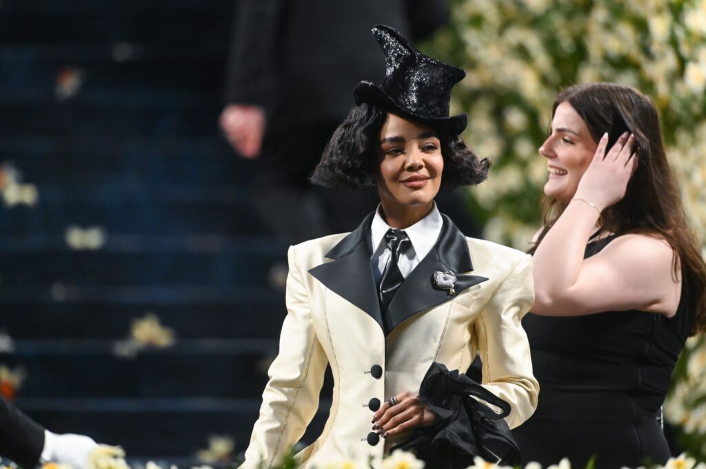 Jodie Turner-Smith brought regal sophistication to the Met steps in a custom burgundy velvet Burberry suit, complete with sharp lapels, flared trousers, and a sculptural Esenshel hat that nodded to Caribbean heritage and modern Black avant-garde. The rich texture and precise tailoring celebrated both British and Afro-diasporic style, while her beauty look, featuring a deep wine lip, bronzed skin, and sleek sculpted edges, added a soft-glam contrast. Turner-Smith’s choice to partner with Burberry reflected her personal roots, making her look not just fashion-forward, but deeply intentional.