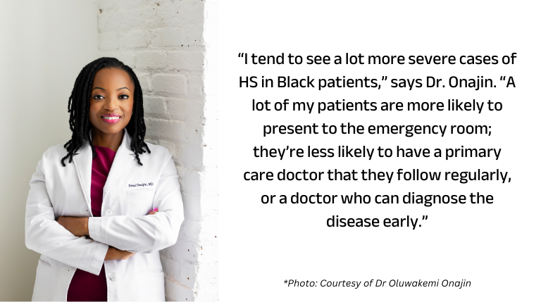 According to Dr Oluwakemi Onajin*, a dermatologist and HS expert at The University of Chicago, Latoya’s path to diagnosis is not uncommon. Especially for women of color, who are statistically more impacted by HS: not only are women more likely to develop this skin condition than men, studies show that Black people in the US are more likely to develop HS than people of other races and ethnic groups.