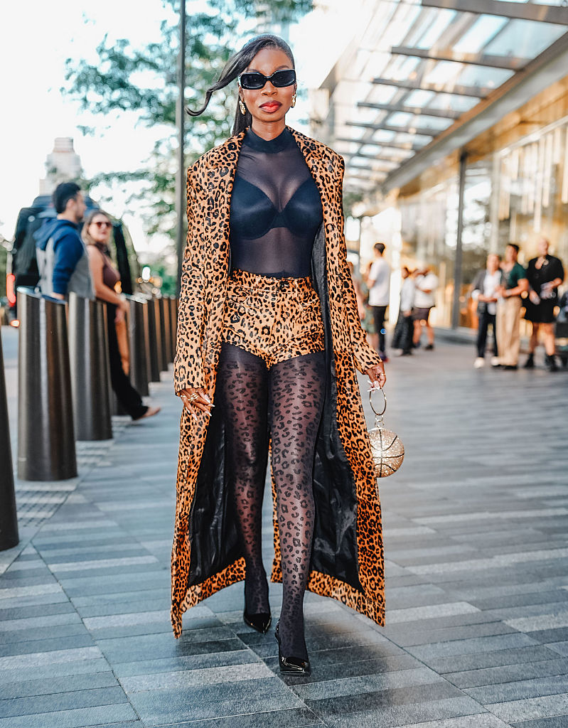 At the InStyle + Delta’s Icons Off the Runway: A Celebration of Style & Sport event, Carthen stole the show in a bold leopard print set that featured a sweeping duster coat and matching shorts layered over a sheer black bodysuit and coordinating tights. She finished the look with sharp black pumps, oversized gold hoops, sleek shades, and a basketball-shaped metallic bag, a clever nod to the event’s theme.