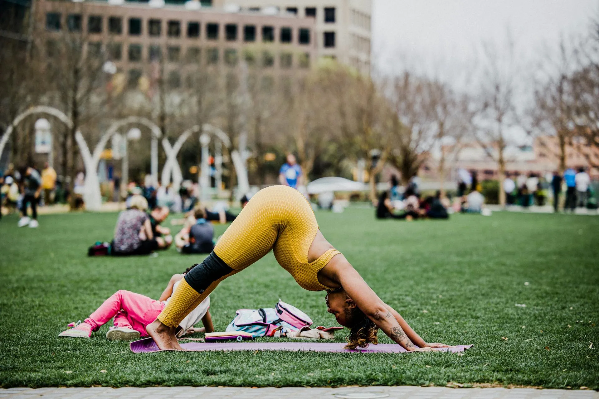 - As you exhale, round your back (like a cat), tucking your chin toward your chest and drawing your navel towards your spine.