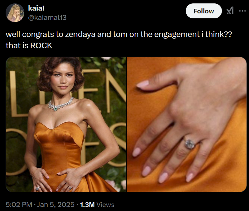 At the 2025 Golden Globes, where Zendaya was nominated for best performance by a female actor in a motion picture for her starring role in Challengers, there was more to talk about than her nomination and custom burnt-orange satin Louis Vuitton dress. Spotted with what looks to be an engagement ring on her finger, buzz has already begun as to whether or not Zendaya is engaged to Tom Holland. Wearing her ring to the Globes might be a ‘soft-launch’ of the relationship milestone.