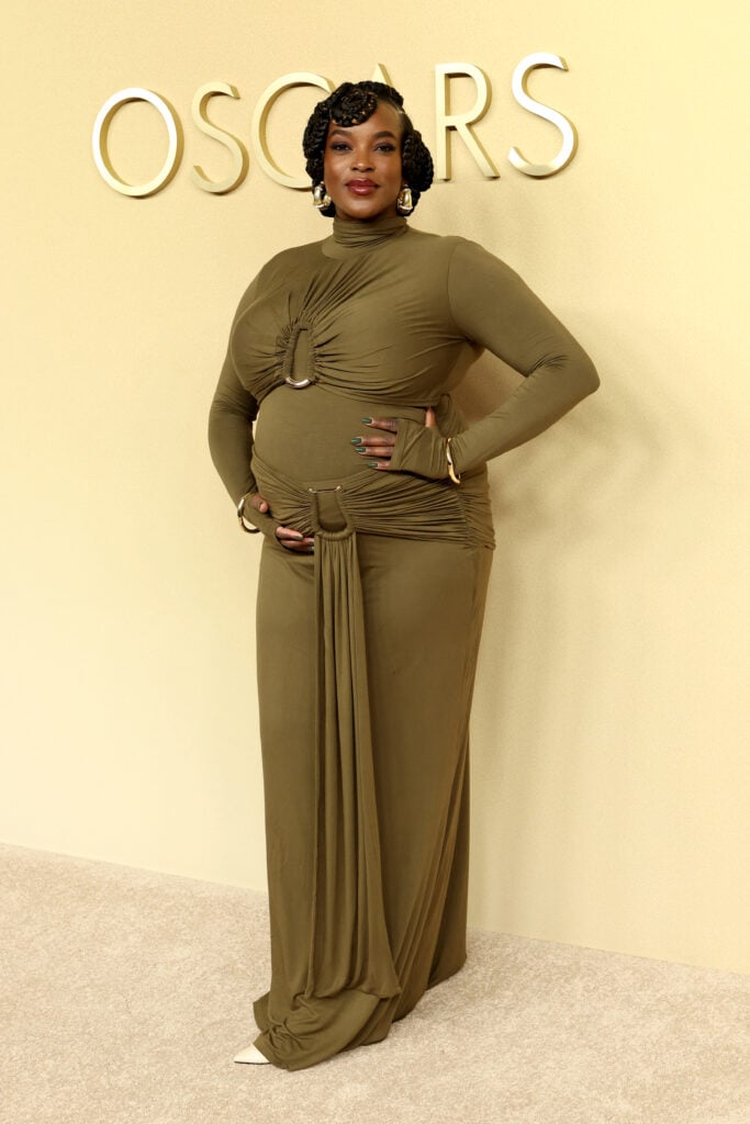 The Oscar nominated actress was the picture of elegance in this olive colored Ri Mi bodycon gown. The perfectly draped dress complimented her growing bump with pops of gold accents. Mosaku wore this to the Oscar Nominees Luncheon and