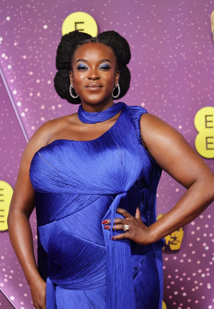 The image that inspired artist DeAnn Wiley’s reimagined illustration features Mosaku in a breathtaking fringed gown. She wore it to the Bafta Film Awards and chose a pop of purple on her eyes to complete the look.